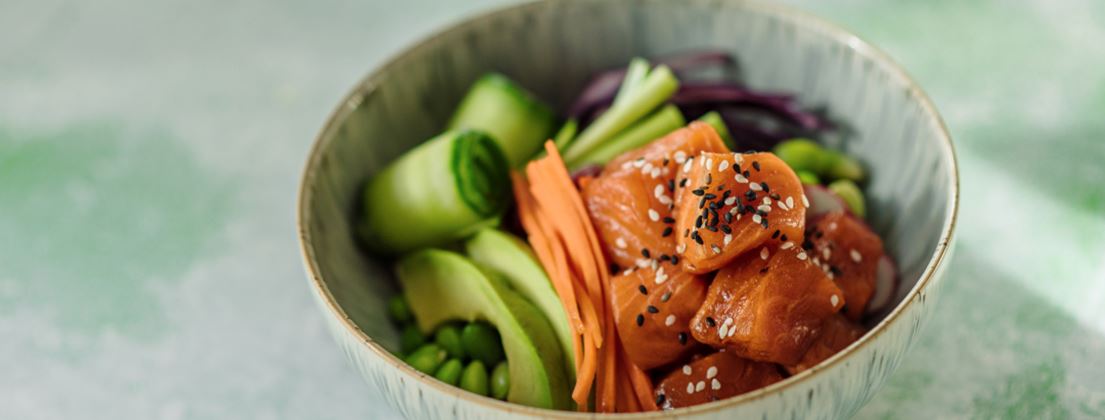 To build the poke bowls split the rice between two bowls for the base. Divide the cucumber, avocado, carrot, edamame beans and red cabbage between each bowl and top with the diced salmon. Drizzle the poke with the sriracha sauce and sprinkle with sesame seeds to serve.